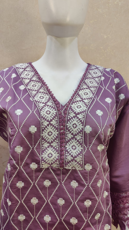 Purple / S-38 / Mul Cotton Purple / M-40 / Mul Cotton Purple / L-42 / Mul Cotton Purple / XL-44 / Mul CottonSilk Kurti with pant and Dupatta set. M91850AUR