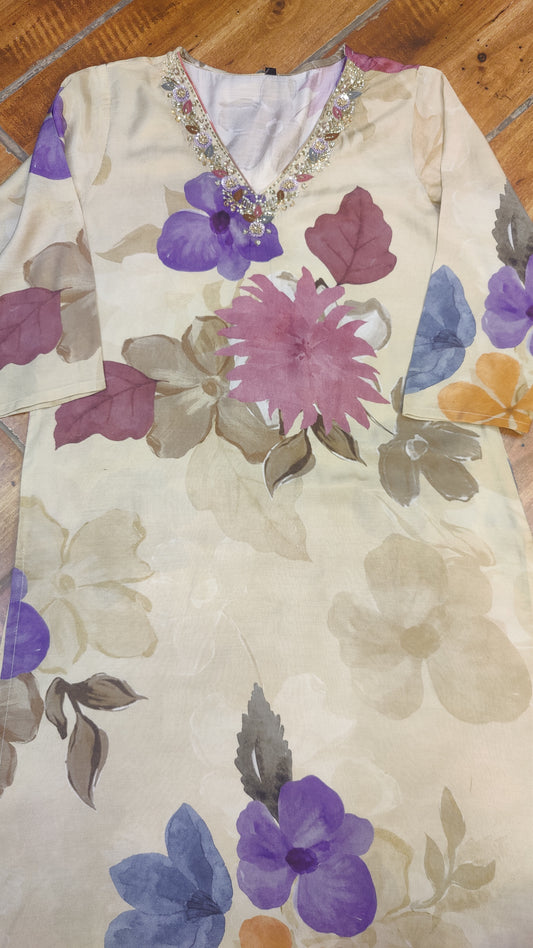 Beige / S-38 / Roman silk Beige / M-40 / Roman silk Beige / L-42 / Roman silk Beige / XL-44 / Roman silkRoman Silk Kurti With Pant And Dupatta set M91125SS