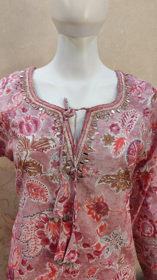 S-38 / Pink / Muslin M-40 / Pink / Muslin L-42 / Pink / Muslin XL-44 / Pink / MuslinPure Muslin Kurti with pant M91195/GB