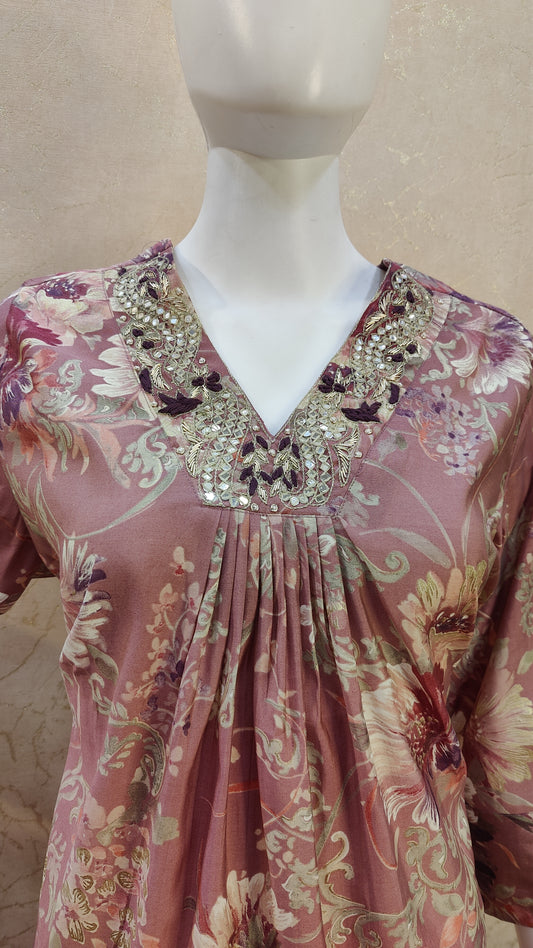 S-38 / Pink / Muslin M-40 / Pink / Muslin L-42 / Pink / MuslinPure Muslin A-line kurti with pant set FM91695MUS