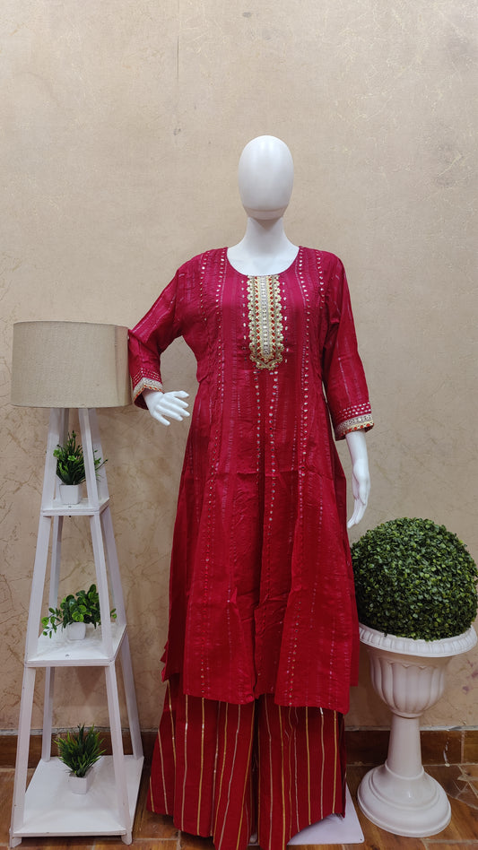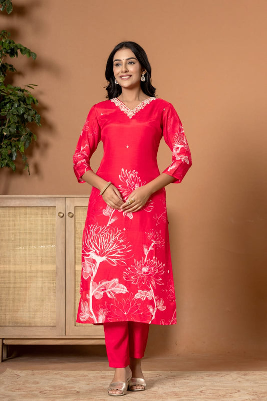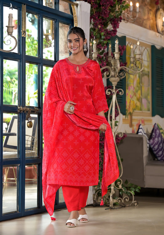 Red / M-40 / Mul Chanderi Red / L-42 / Mul ChanderiMul Chanderi kurti with pant and dupatta set M92300RF