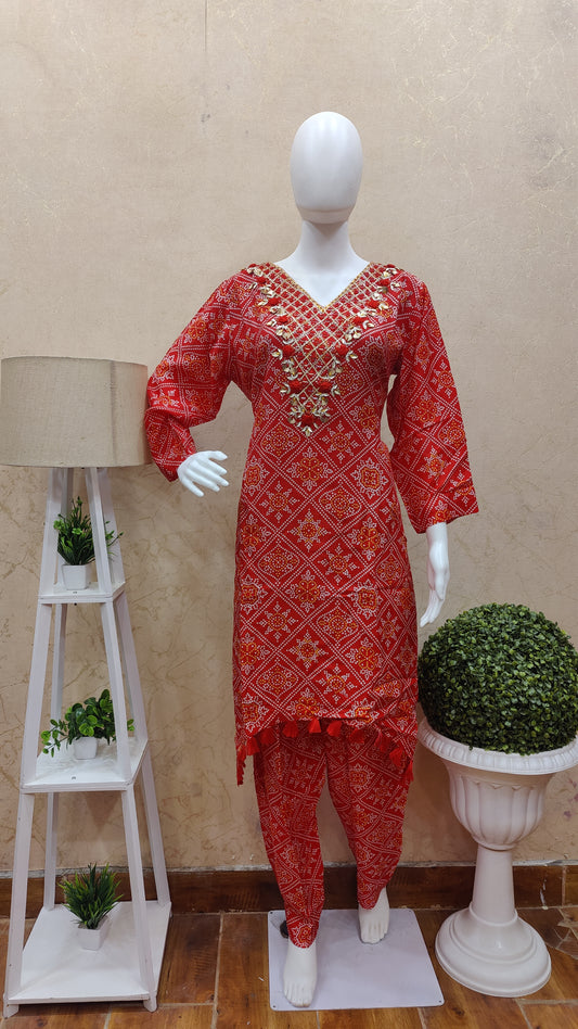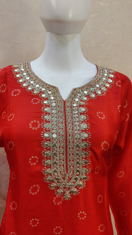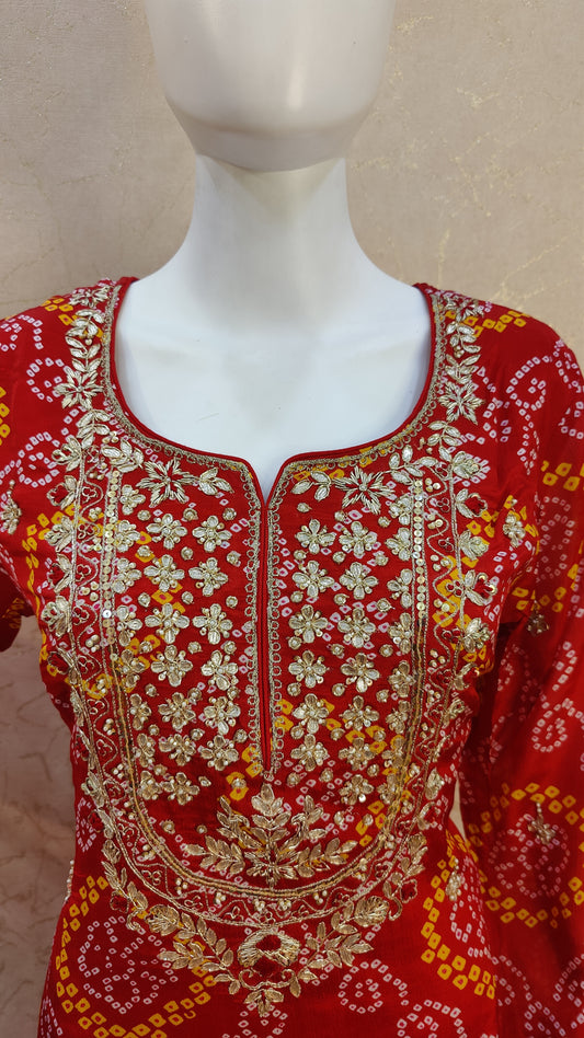 Pure Chinon Bandhej Kurti with pant and Dupatta M9200SSCHINO