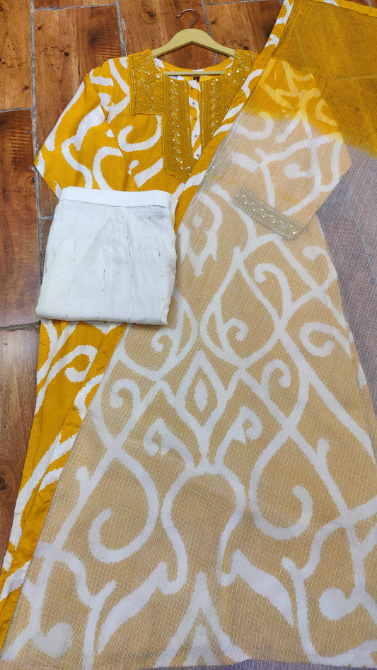 Yellow / S-38 / Mul Chanderi Yellow / M-40 / Mul Chanderi Yellow / L-42 / Mul Chanderi Yellow / XL-44 / Mul ChanderiMul Chanderi Kurti With Pant And Dupatta set M91750SF