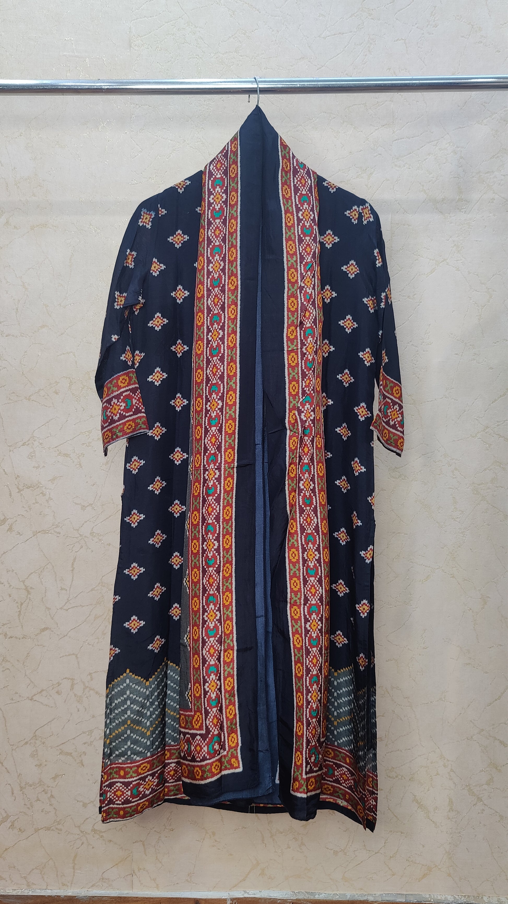 Expertly crafted with a Patola print, this Silk Kurti set offers a touch of elegance and style. The unique design is perfect for any occasion, while the lightweight material provides comfort all day long. Complete with pant and dupatta, this set is a versatile addition to your wardrobe.