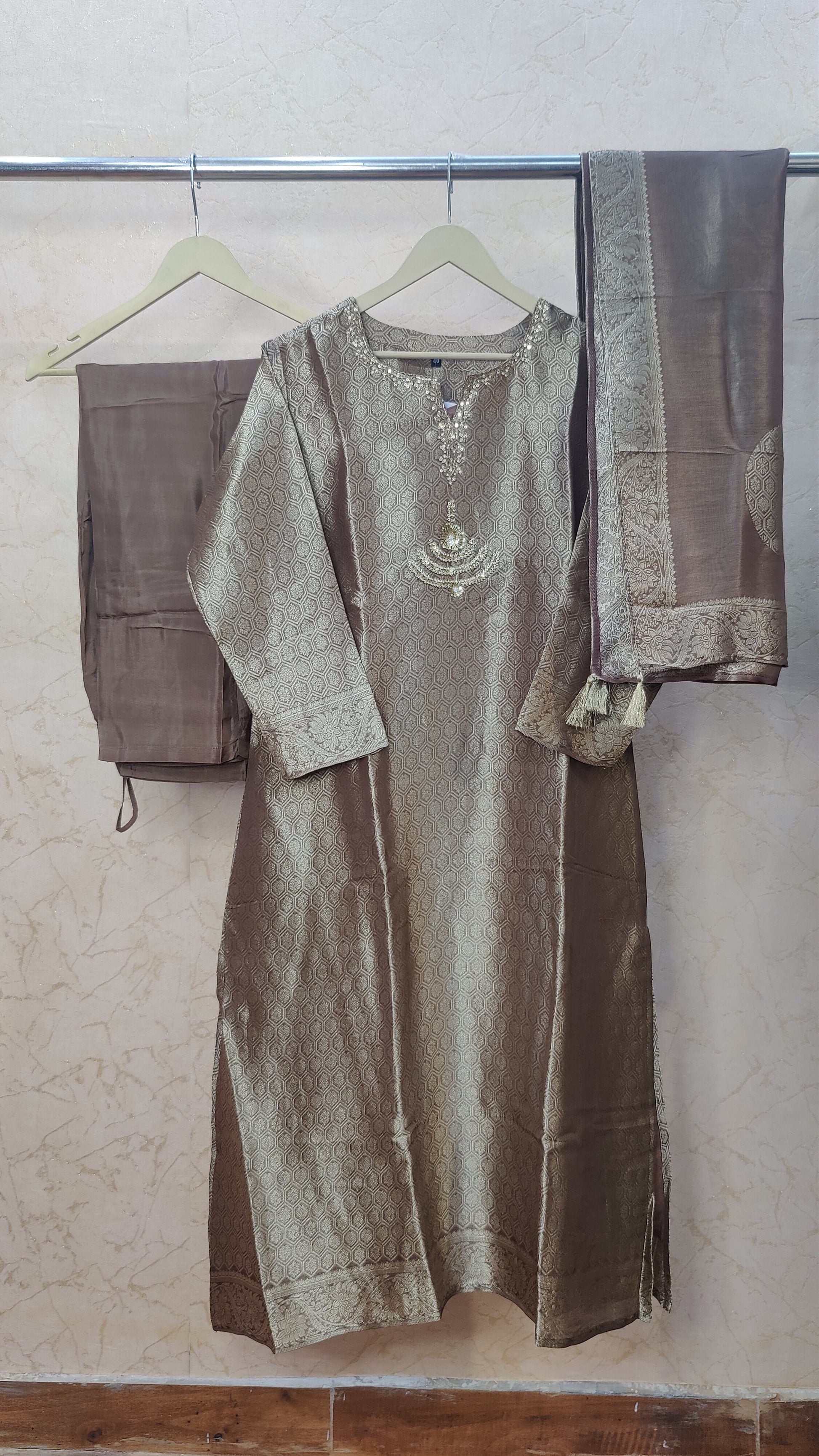 Enhance your traditional wardrobe with our Pure Silk Kurti set. This elegant set features exquisite Zari work that adds a touch of opulence to the piece. Made from high-quality pure silk, it offers both comfort and luxury. Complete with a pant and dupatta, this set is perfect for any special occasion.