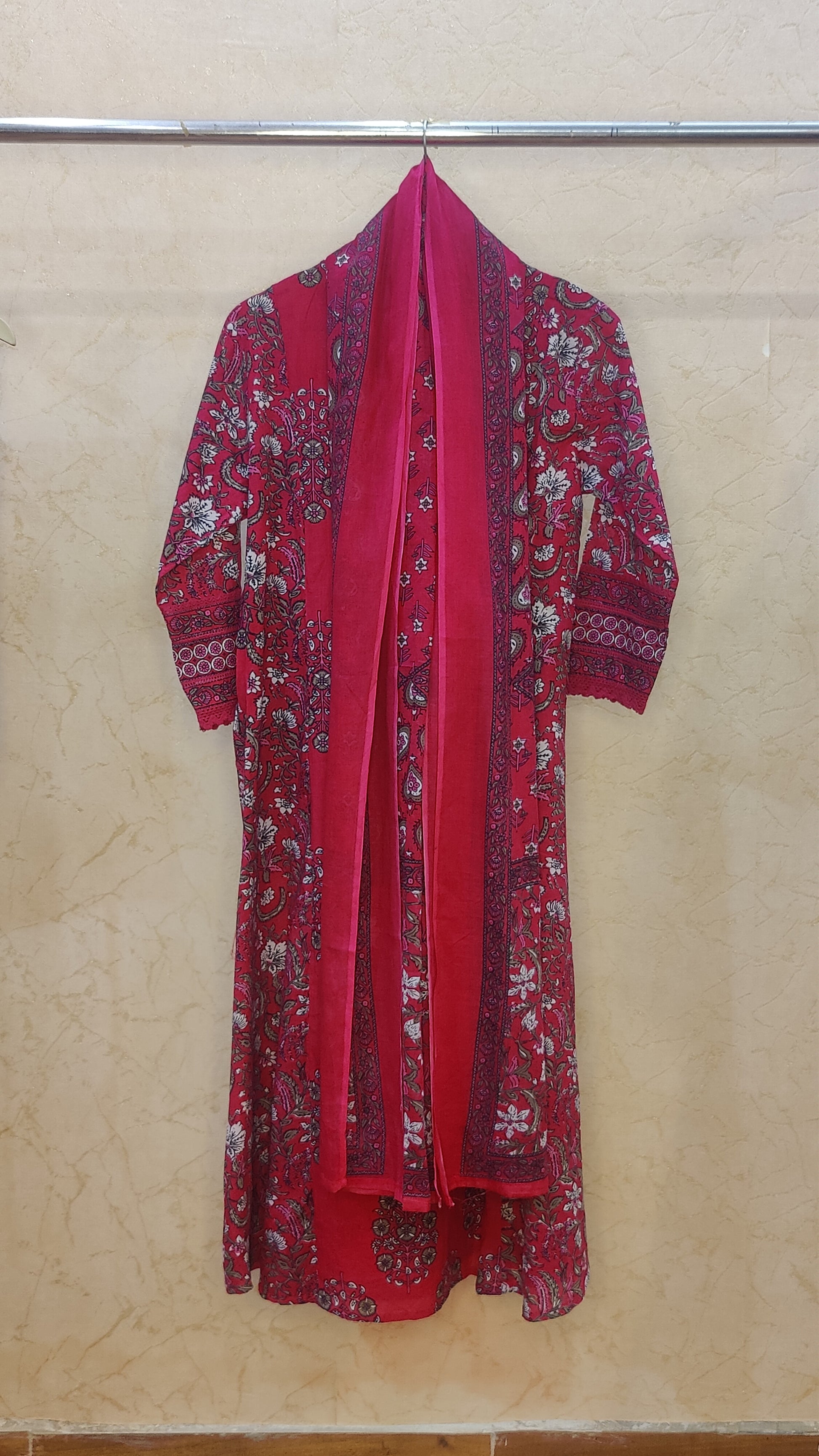 This stunning pink cotton suit set features a beautifully printed kurti paired with matching bottom and dupatta.