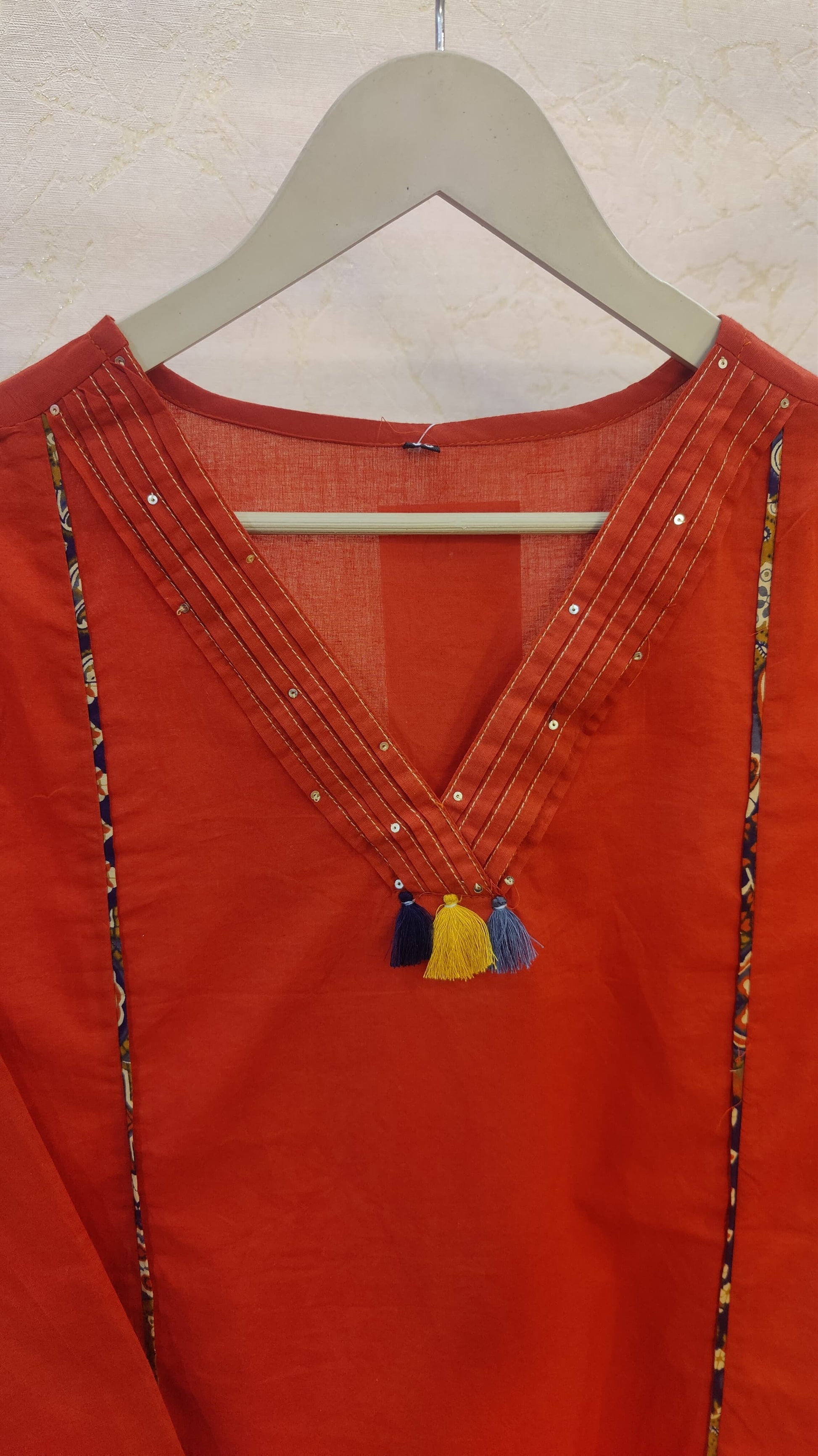 Stunning pure cotton three-piece suit featuring a vibrant red kurta with intricate patchwork embroidery and tassel detailing on the front panel and neckline. The set includes matching red cotton bottoms and a rich blue Kalamkari-printed dupatta with traditional paisley motifs, adding an elegant contrast to the ensemble. Crafted for comfort and style, it’s perfect for casual festive wear.