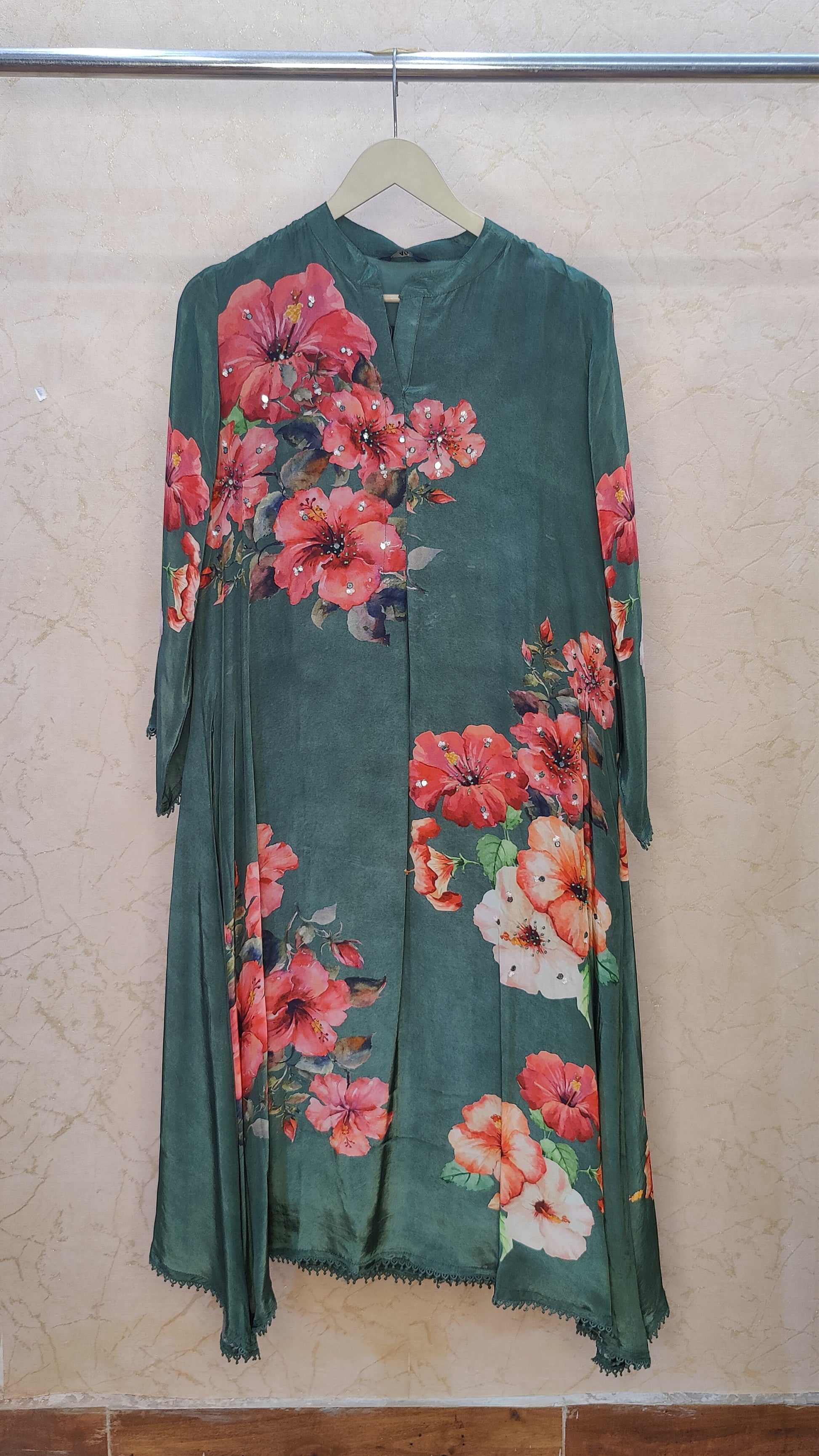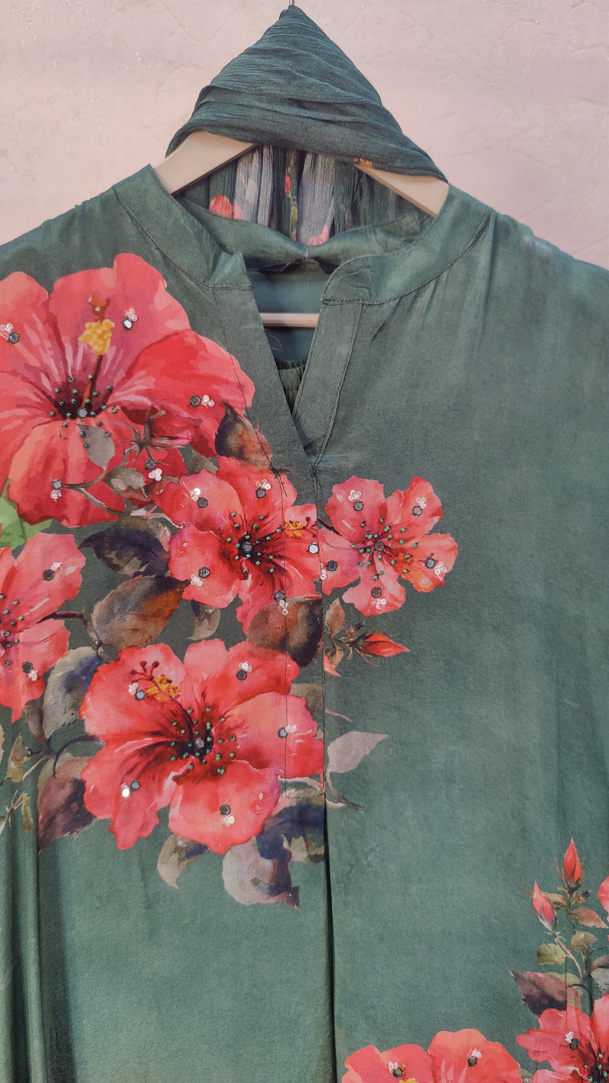 Expertly crafted from pure crape fabric, this kurti set offers both style and comfort. The vibrant floral print and A-line cut add a touch of elegance to the green color. Complete with a pant and dupatta, this set is perfect for any occasion.
