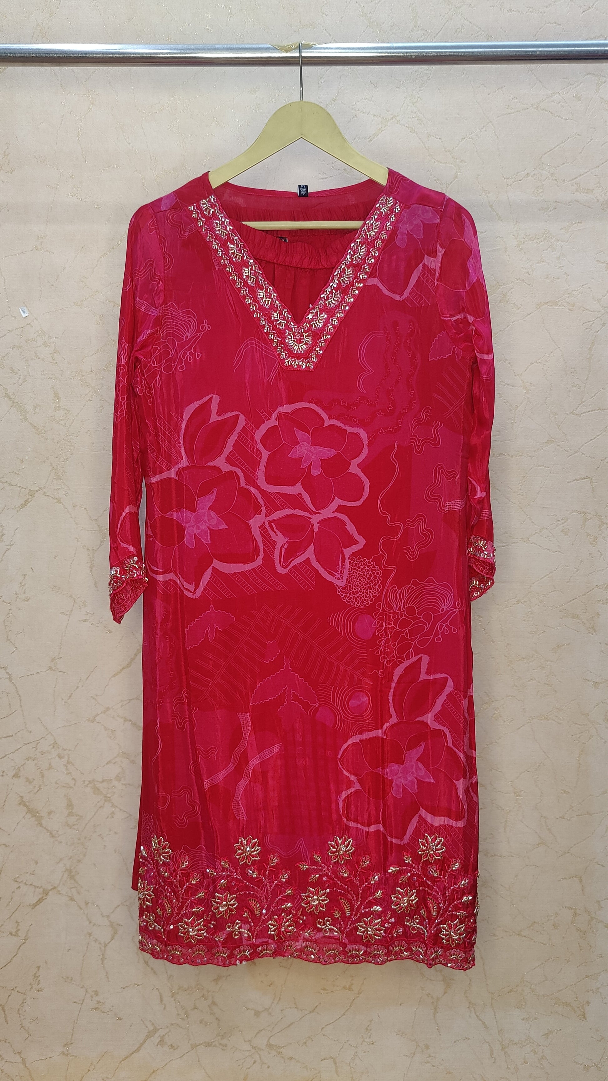 Effortlessly elegant and versatile, the Crape Kurti set (handcrafted with intricate work) in vibrant red is a must-have for any wardrobe. This set comes with a pant and dupatta, making it perfect for any occasion. Add a touch of sophistication to your outfit with this beautiful and unique ensemble.