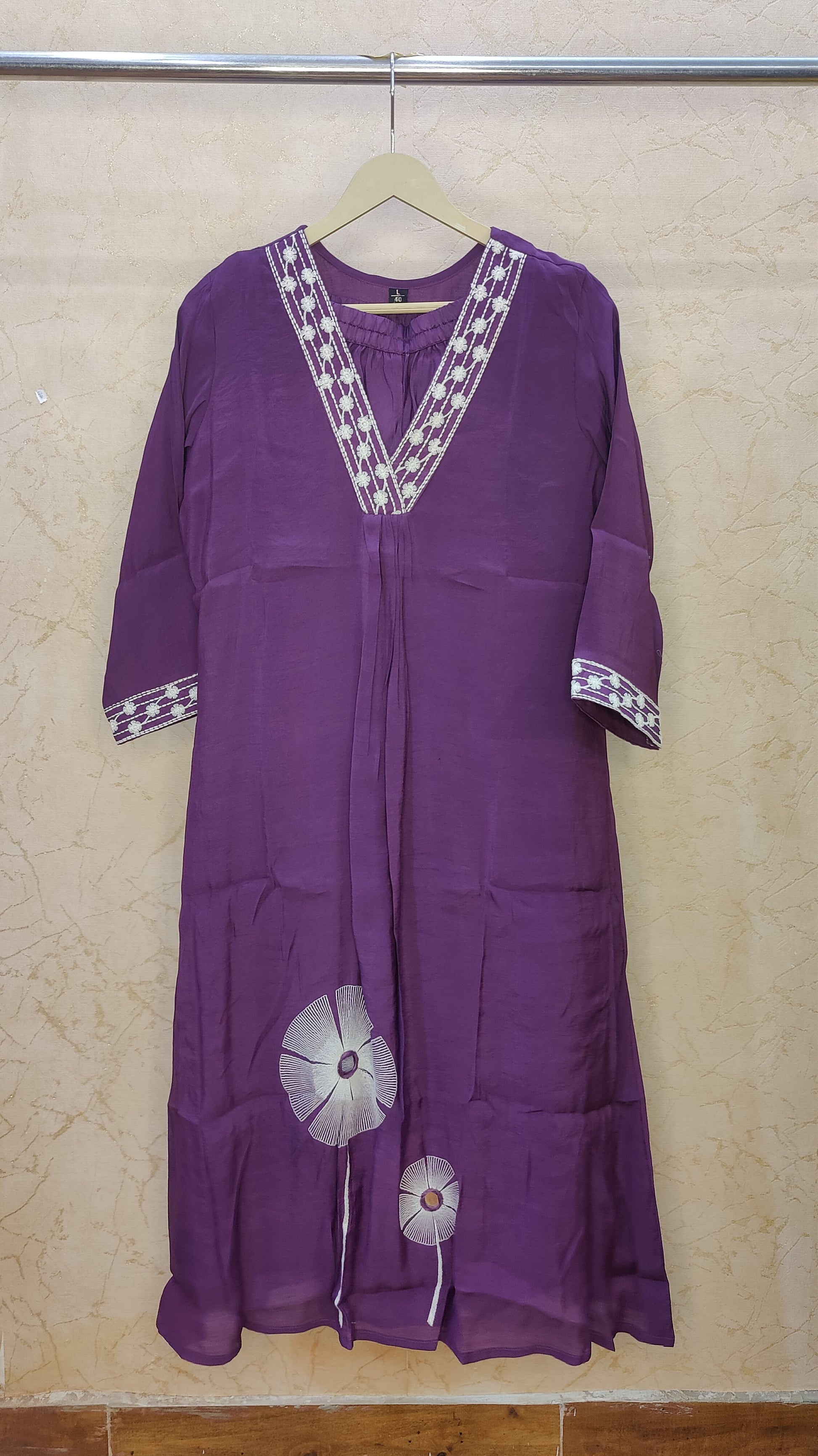"Step up your style with our Mul Chanderi Kurti set. The A-line design, in a gorgeous shade of purple, provides a flattering silhouette. The set includes a matching pant and dupatta for a complete and chic look. Upgrade your wardrobe with this must-have ensemble."