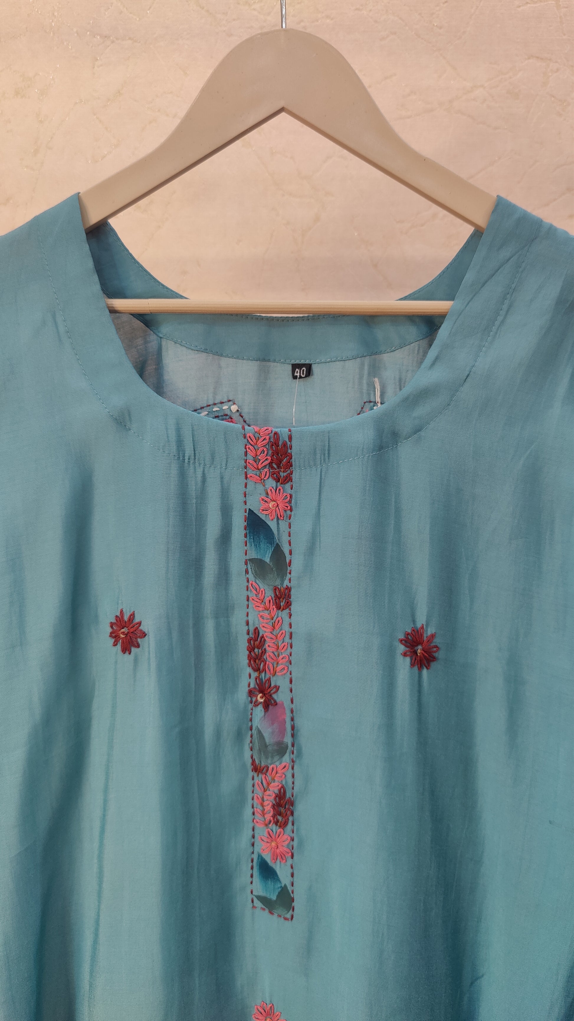 This Roman Silk Kurti set features intricate embroidery for an elegant and stylish look. Made from high quality silk, it provides comfort and durability. The set includes a pant and dupatta for a complete and versatile outfit. Perfect for any occasion.