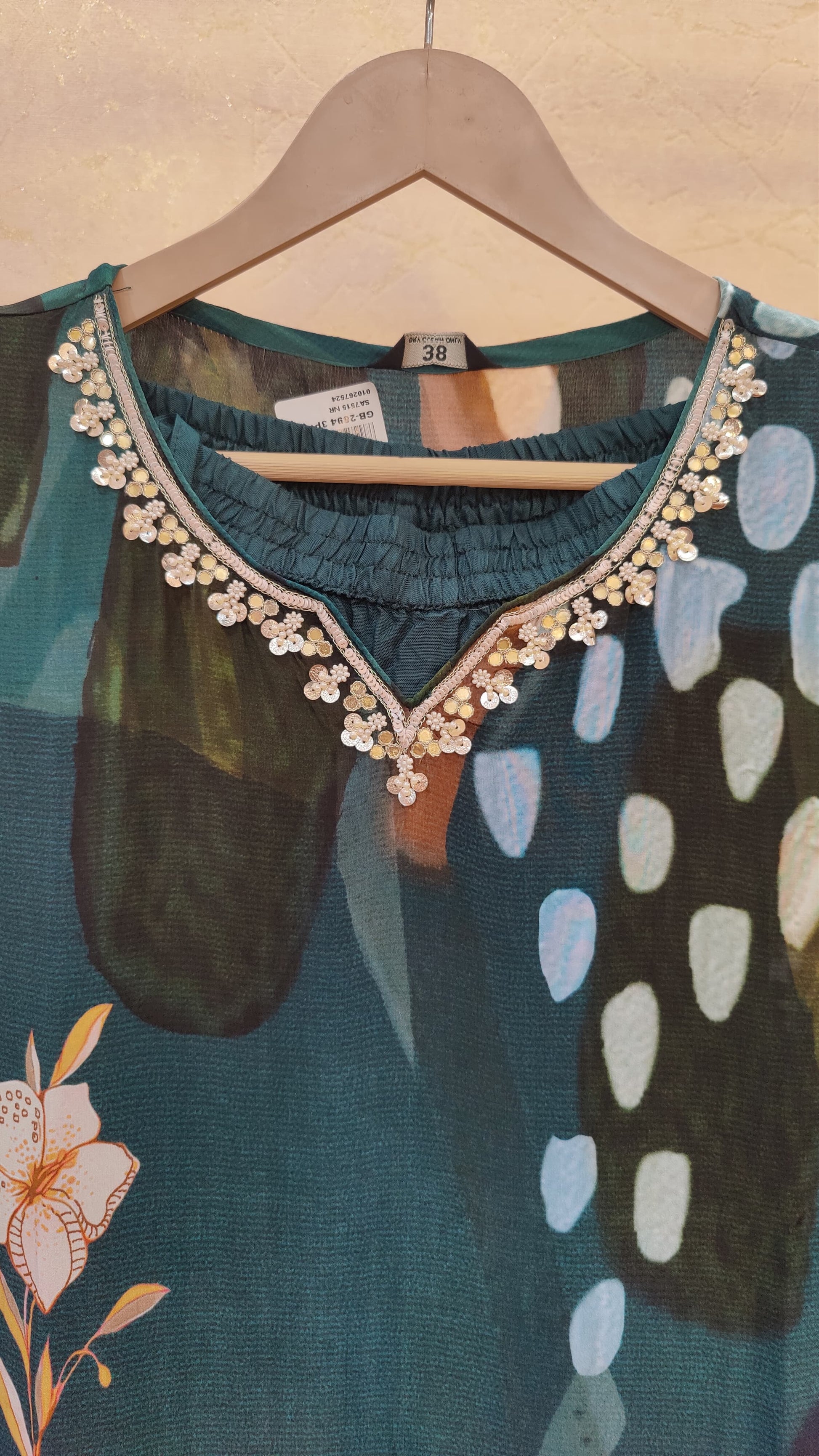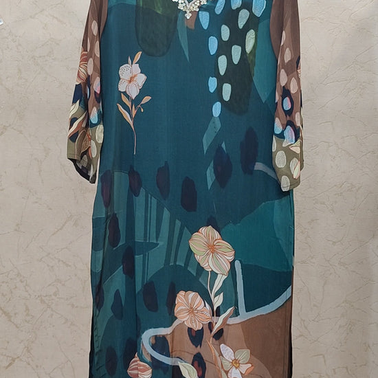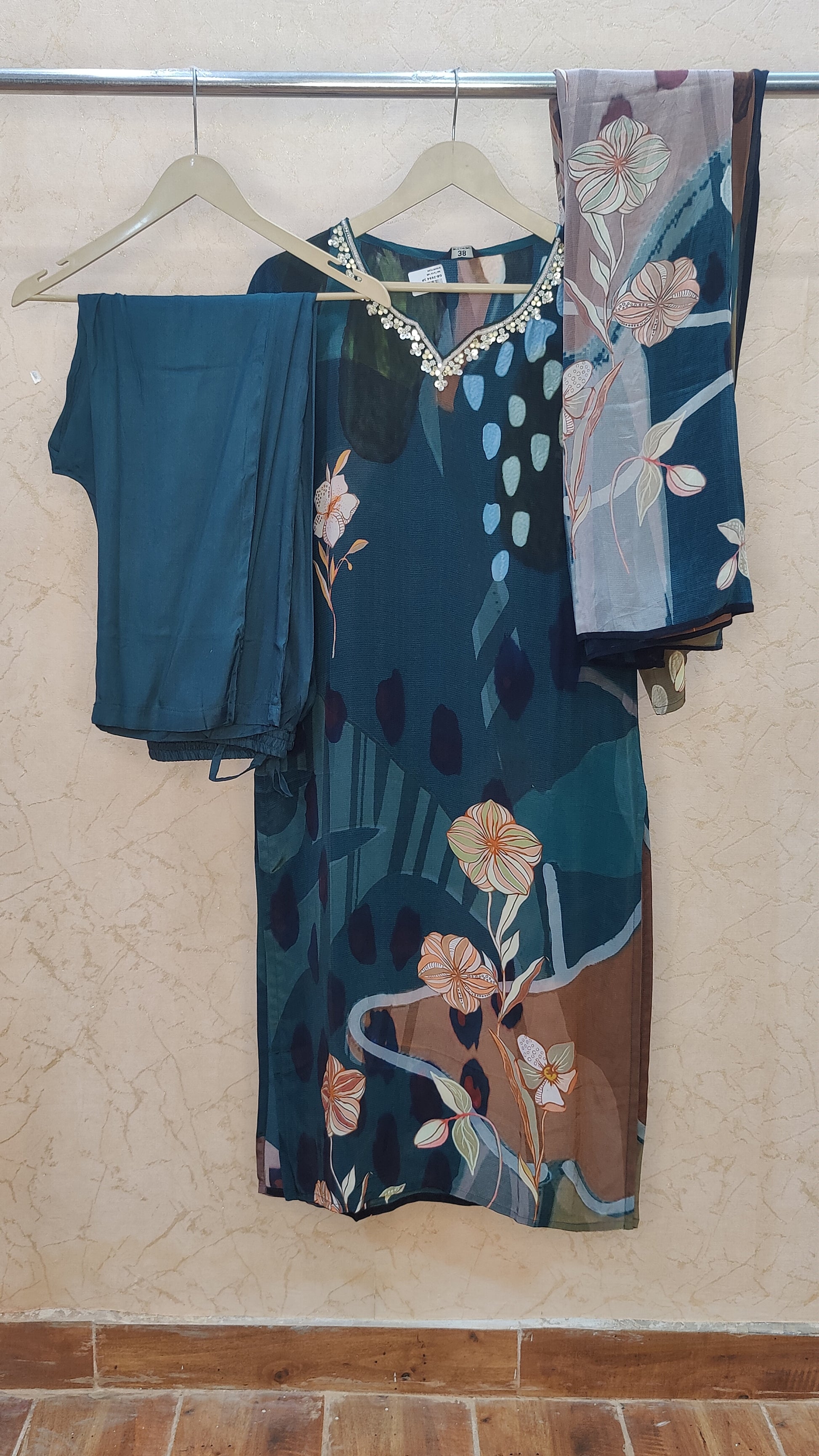 This Pure Crape Kurti, pant, and dupatta set is a must-have addition to your wardrobe. Made with high-quality Pure Crape fabric and featuring a stunning digital print, this set offers both style and comfort. With its versatile design, it can be worn for any occasion. Upgrade your look with this elegant and trendy set.