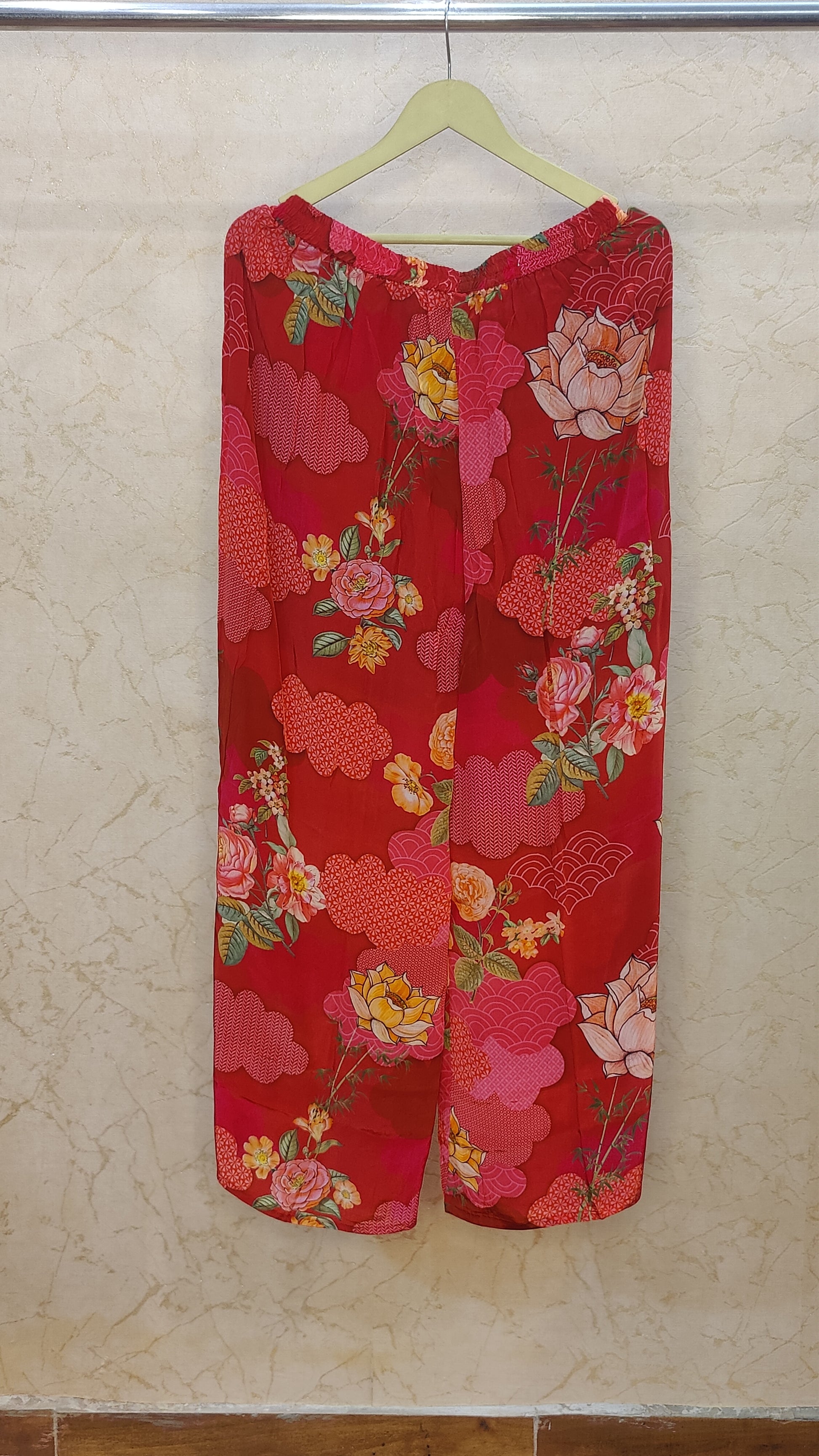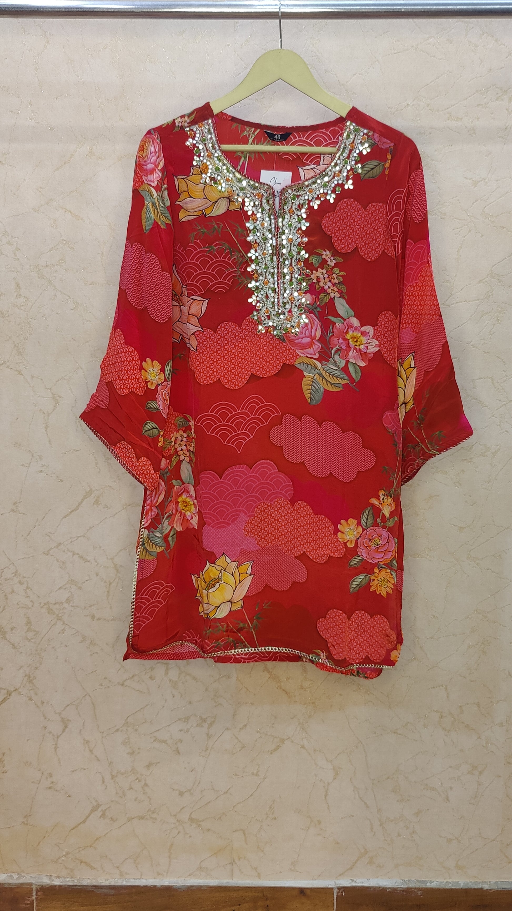 Upgrade your wardrobe with our elegant Pure Crape Kurti set. Made from high-quality pure crepe, this set features a stylish red color with a vibrant floral print. Includes a kurti, pant, and dupatta for a complete, sophisticated look. Perfect for any occasion.