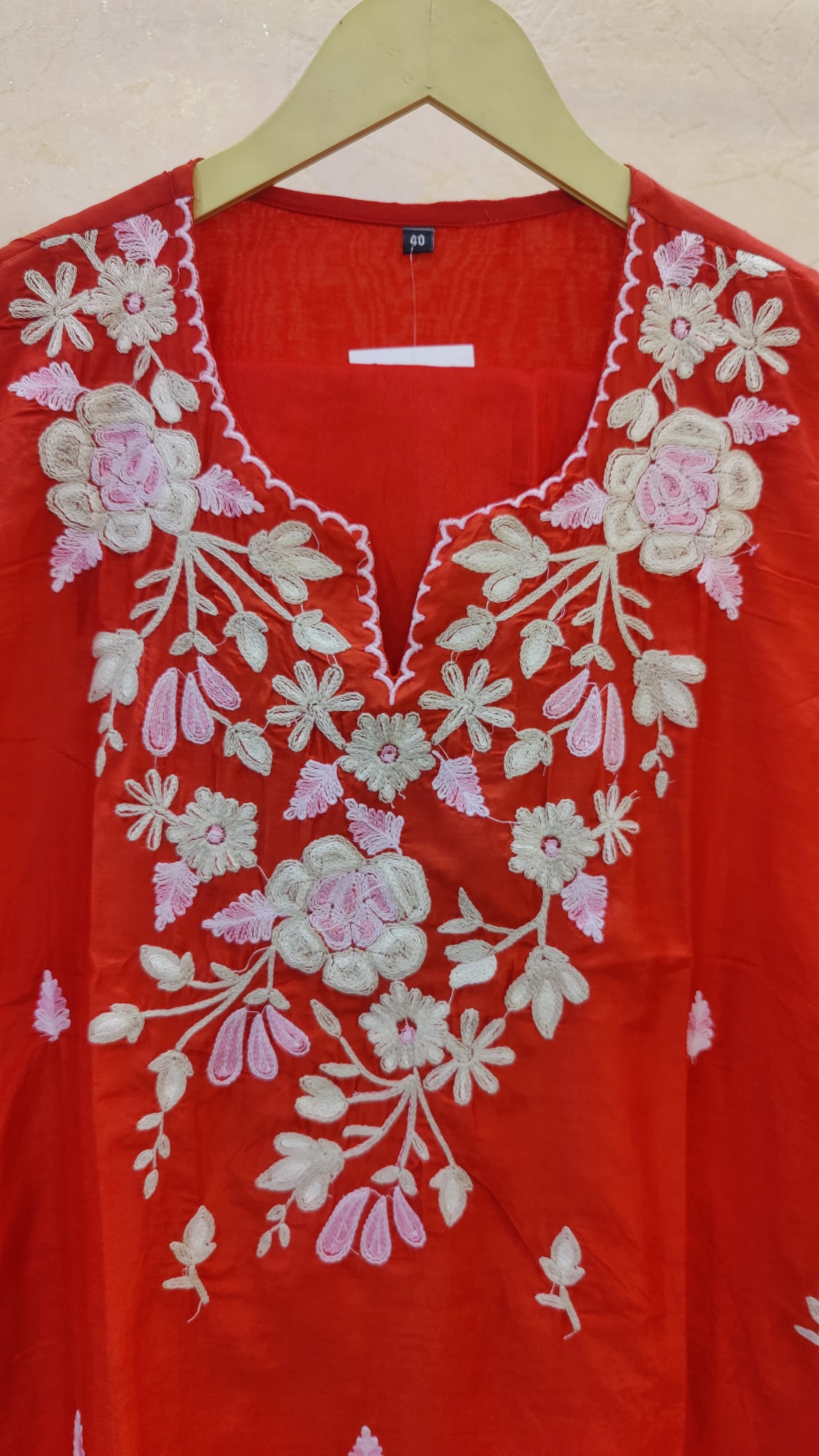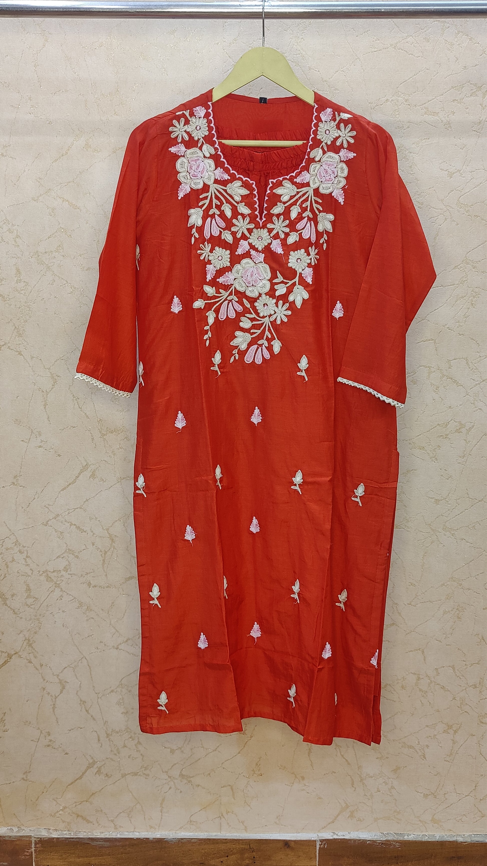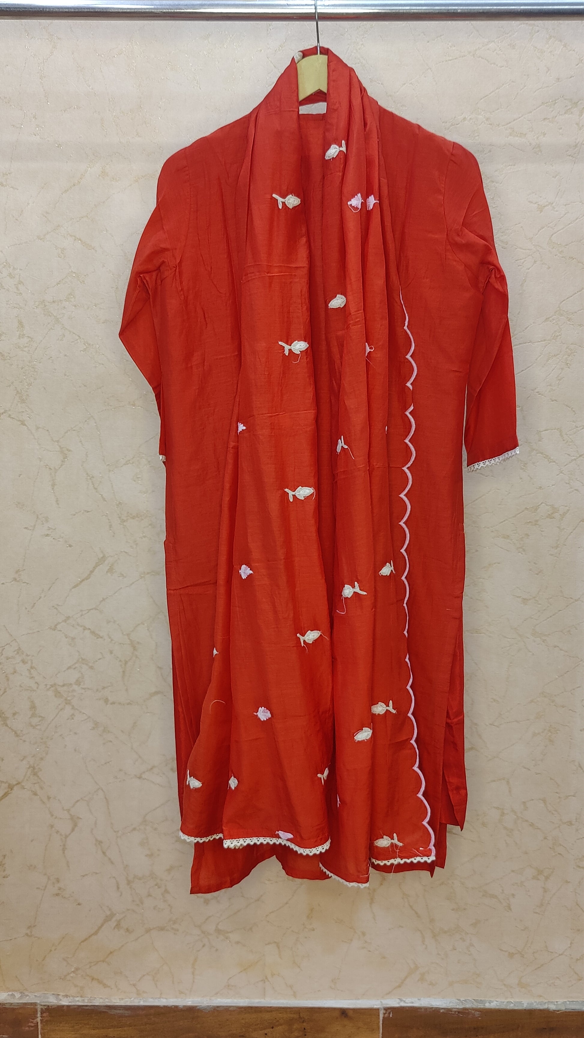This rust orange relaxed fit Kurti with pant and Dupatta set is made of high-quality mul chanderi fabric, known for its light weight and softness. With intricate embroidery, it exudes elegance and comfort for any occasion. The perfect addition to your wardrobe.
