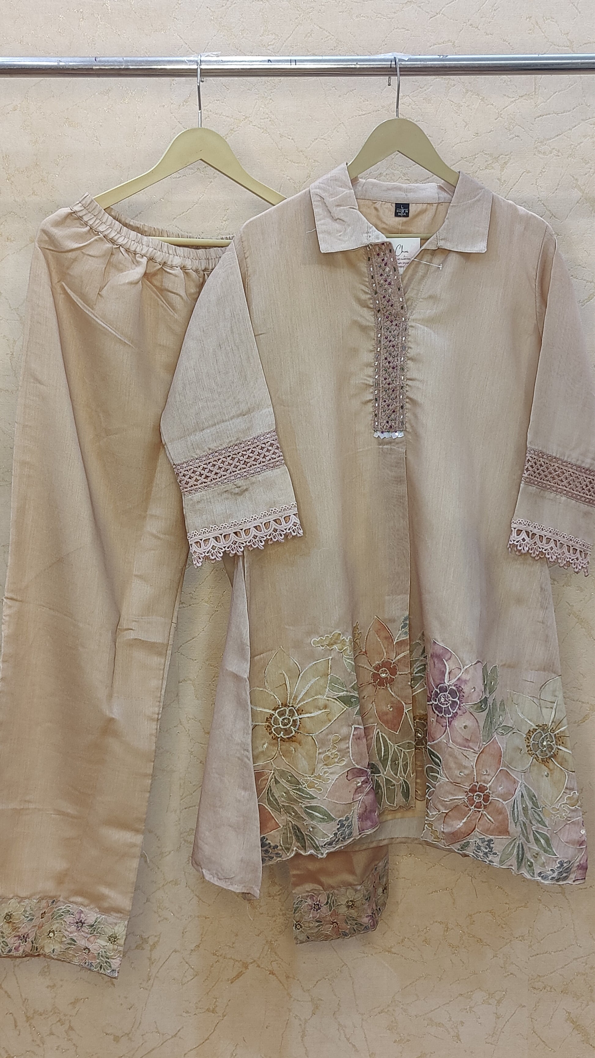 This Tissue Silk Co-ord set boasts exquisite embroidery work and a flattering A-line silhouette. The delicate fabric adds a touch of luxury while the design provides a comfortable and stylish fit. Perfect for special occasions or elevating your everyday attire.