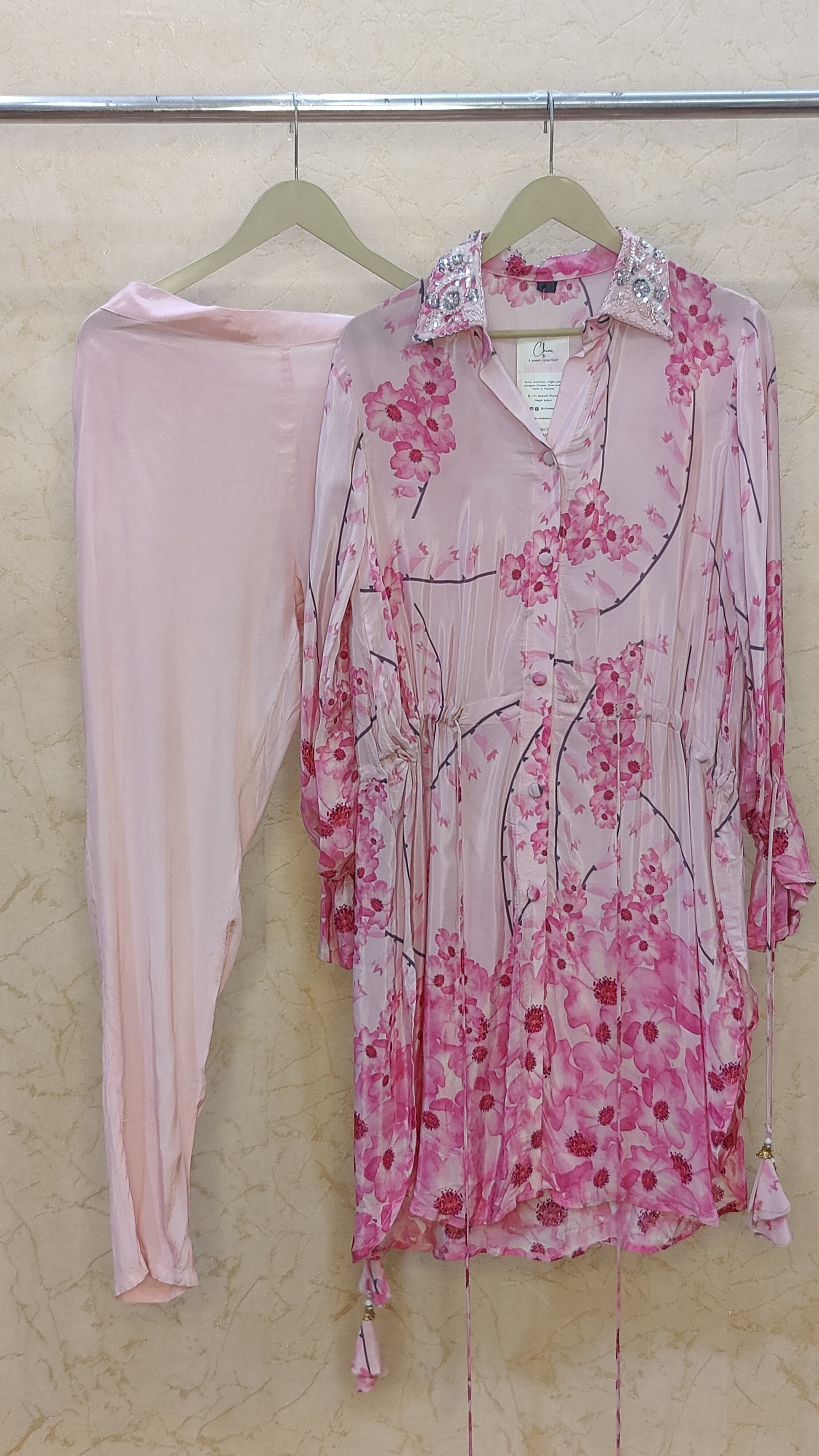 This silk coord set showcases intricate hand work on the collar and sleeves, adding a touch of unique craftsmanship. The delicate floral print adds a feminine and elegant touch, making it a standout piece in any wardrobe. Elevate your style with this luxurious and one-of-a-kind set.