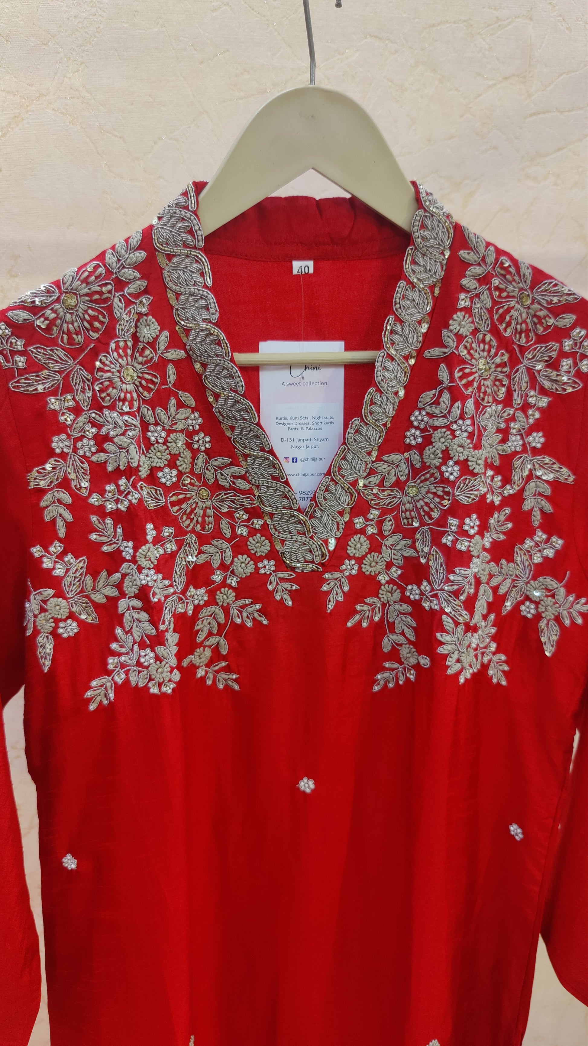 Indulge in the luxury of this Pure Silk Kurti with pant and dupatta set. Adorned with exquisite hand work and a rich red color, this ensemble exudes elegance and sophistication. Made from the finest quality silk, it offers comfort and style to elevate your wardrobe.