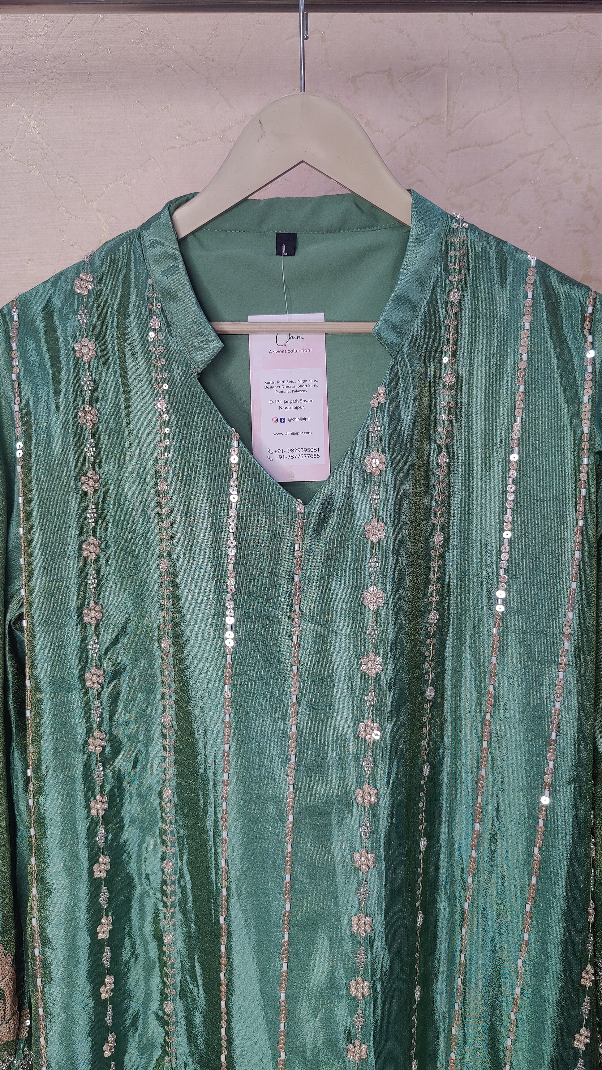 This elegant Pure Tissue Silk Co-ord Set features hand work and a rich green color. The unique silk material provides a luxurious feel and the intricate hand work adds a touch of sophistication. Elevate your wardrobe with this timeless, expertly crafted ensemble.