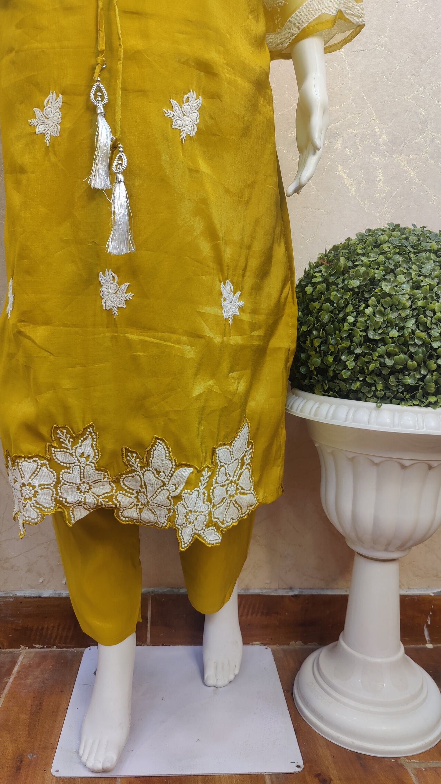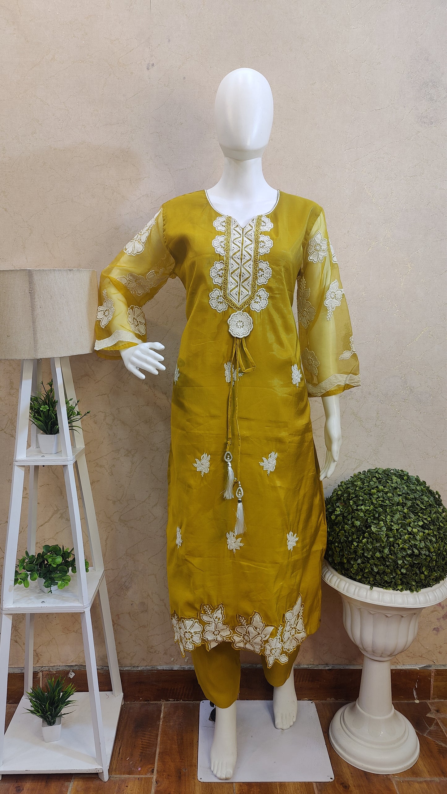 This elegant ensemble features a pure silk kurti with intricate embroidery detailing, paired with complementary pants. The set is beautifully complemented by a delicate organza dupatta, adding a touch of ethereal charm. The intricate embroidery work on the kurti enhances its appeal, making it a perfect choice for a special occasion or a festive event.